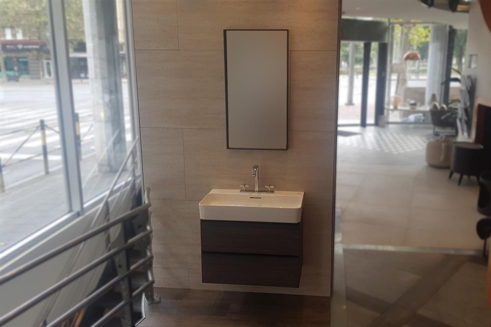 Set uključuje ogledalo sa led rasvetom, keramički lavabo i nameštaj od furnirane šperploče