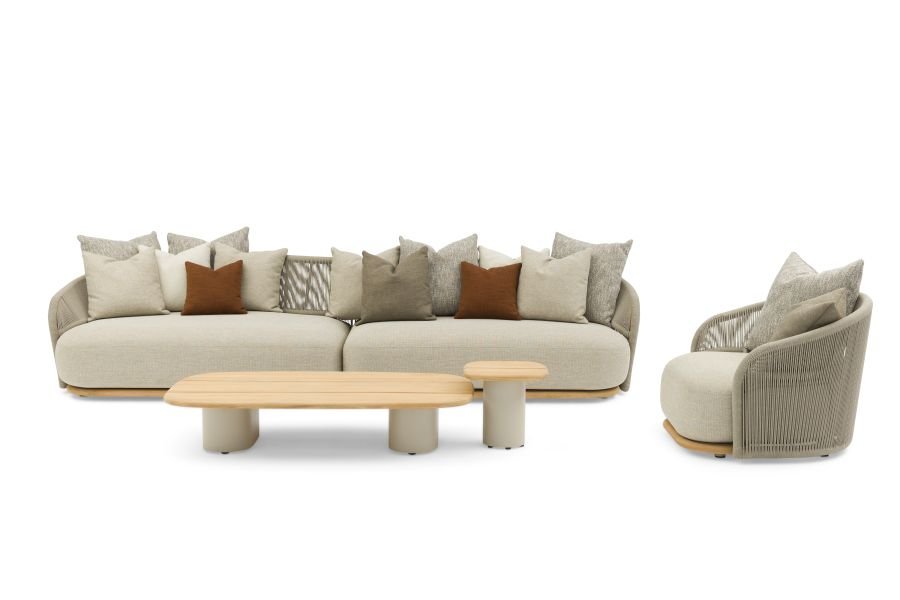 Okvir od aluminija + FSC tikovine, olefinsko uže, sa 6 kom jastuka: 60*60 cm * 2 kom, 50*50 cm * 3 kom, 40*40 cm * 1 kom